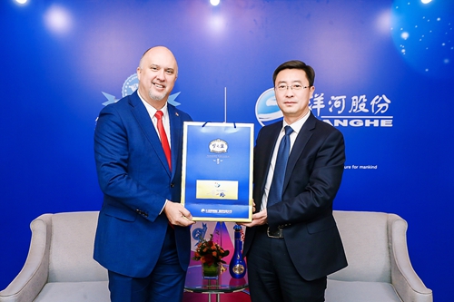 洋河股份黨委書記、董事長(zhǎng),雙溝酒業(yè)董事長(zhǎng)張聯(lián)東(右)向古巴駐華大使