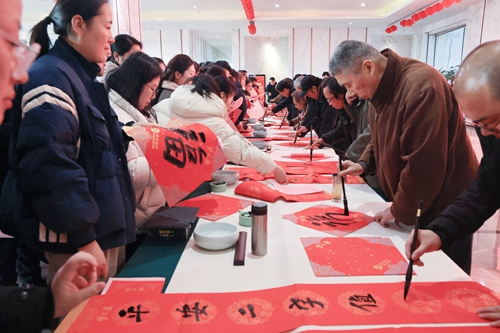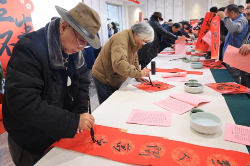 隨著蛇年春節(jié)腳步臨近,活動期間還舉辦了“文化惠民”活動,江蘇省當(dāng)代藝術(shù)創(chuàng)作研究會的文化學(xué)者揮毫潑墨,寫對聯(lián)、送福字,為大家送來了新年的祝福。